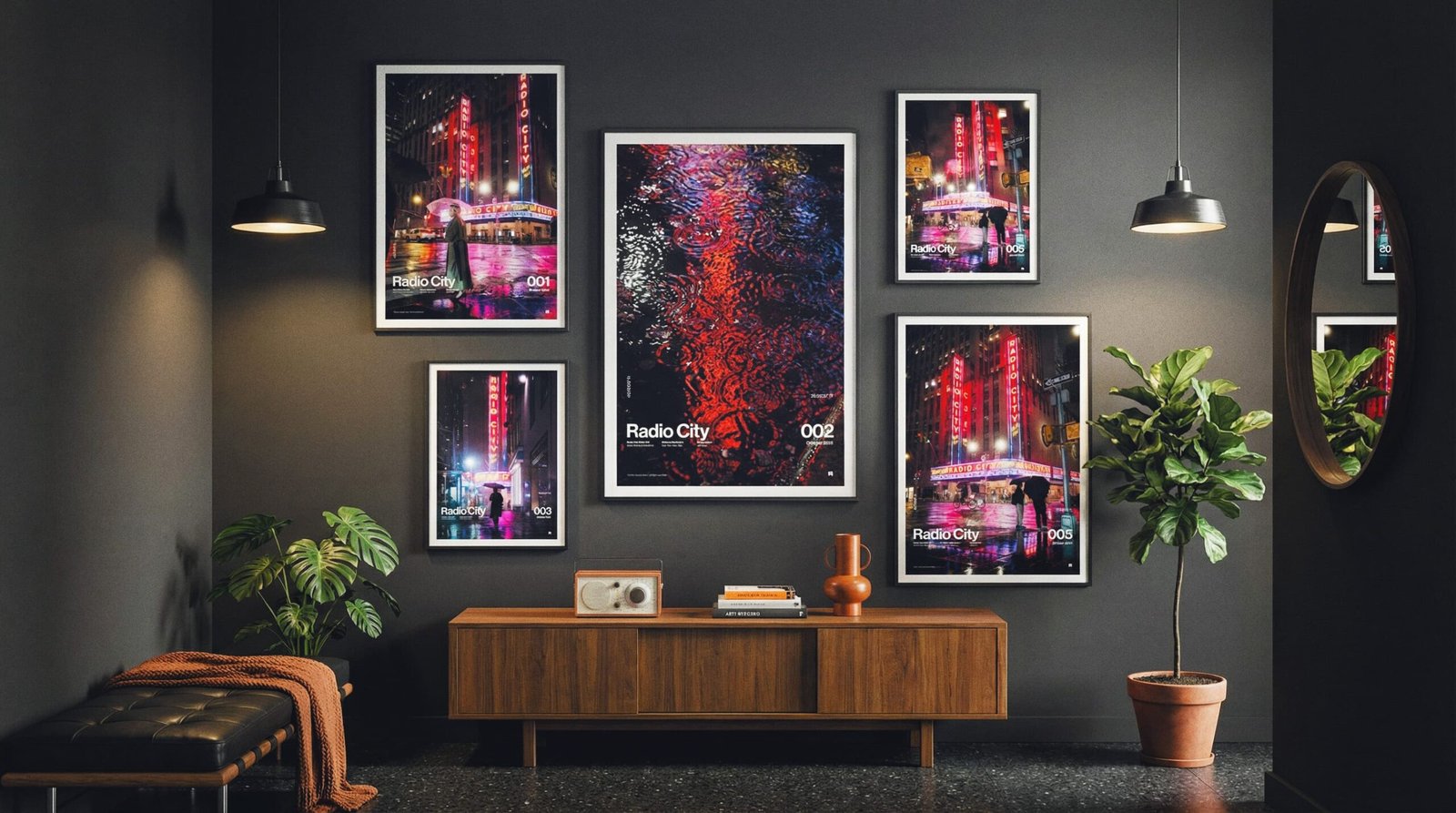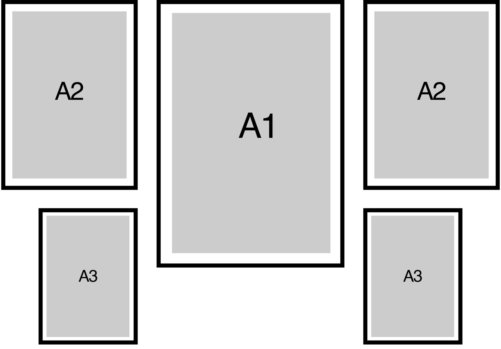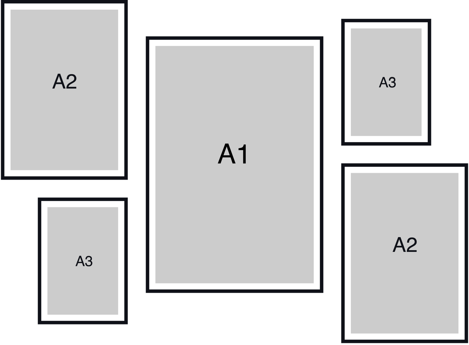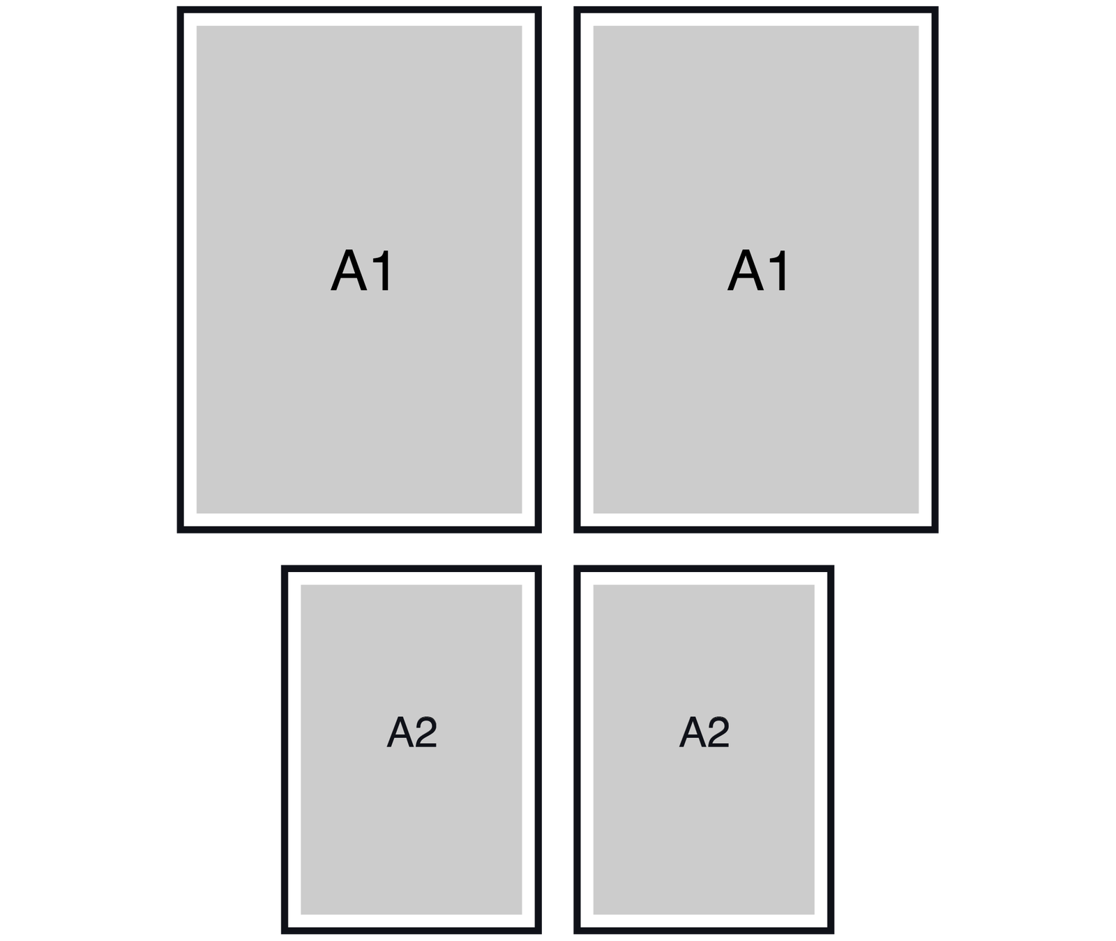 Hang the two A1s first (top row), lock the center gap, then place the A2s directly beneath—keep the vertical gap identical to the center gap.