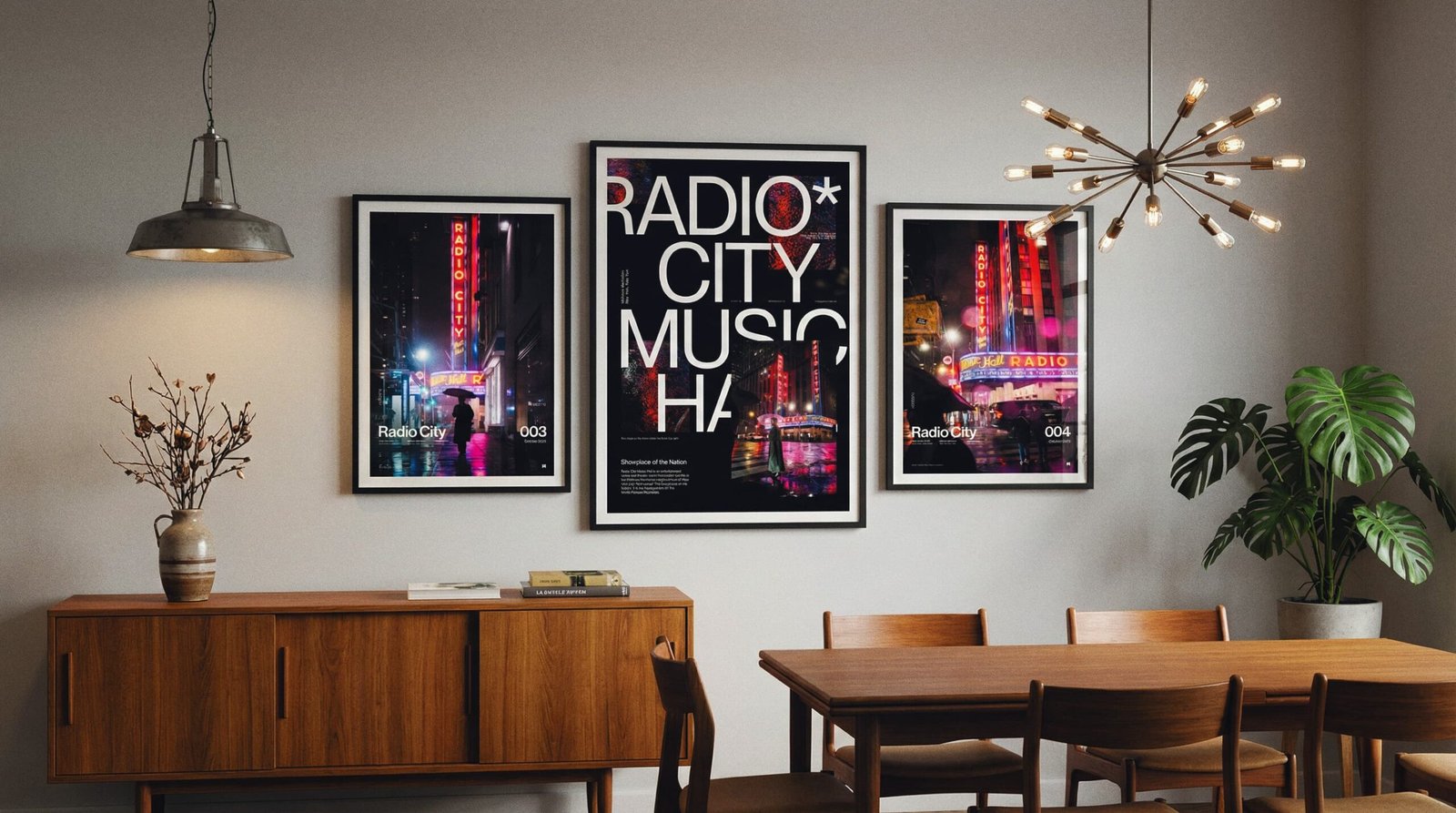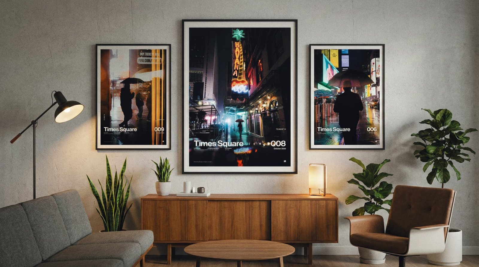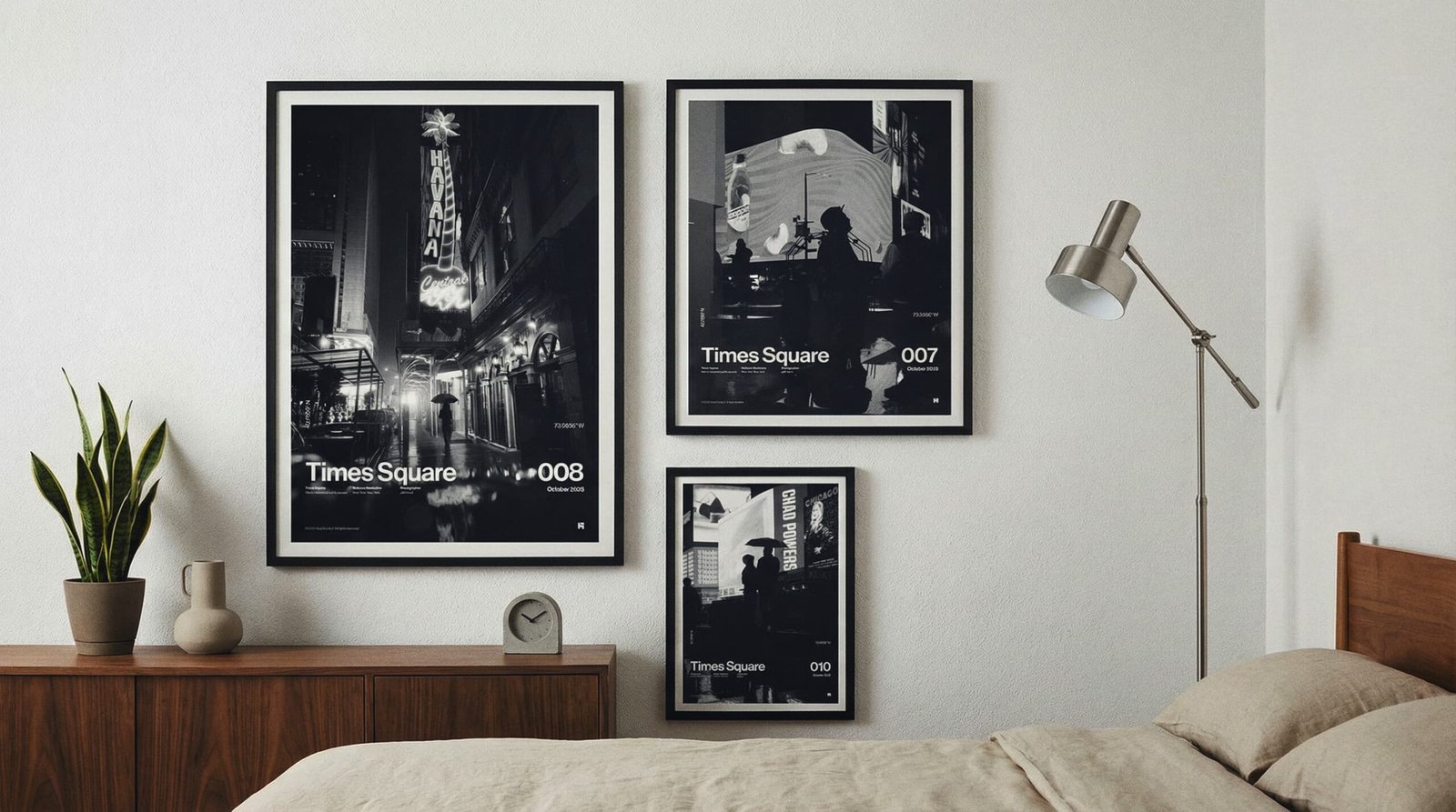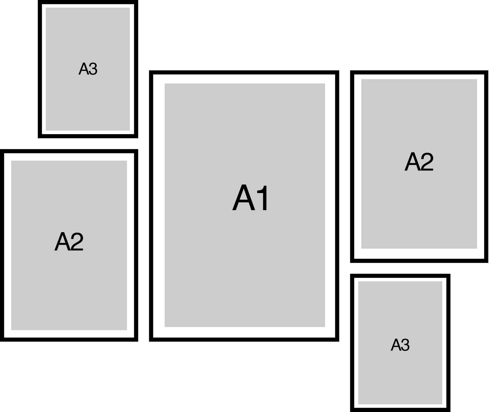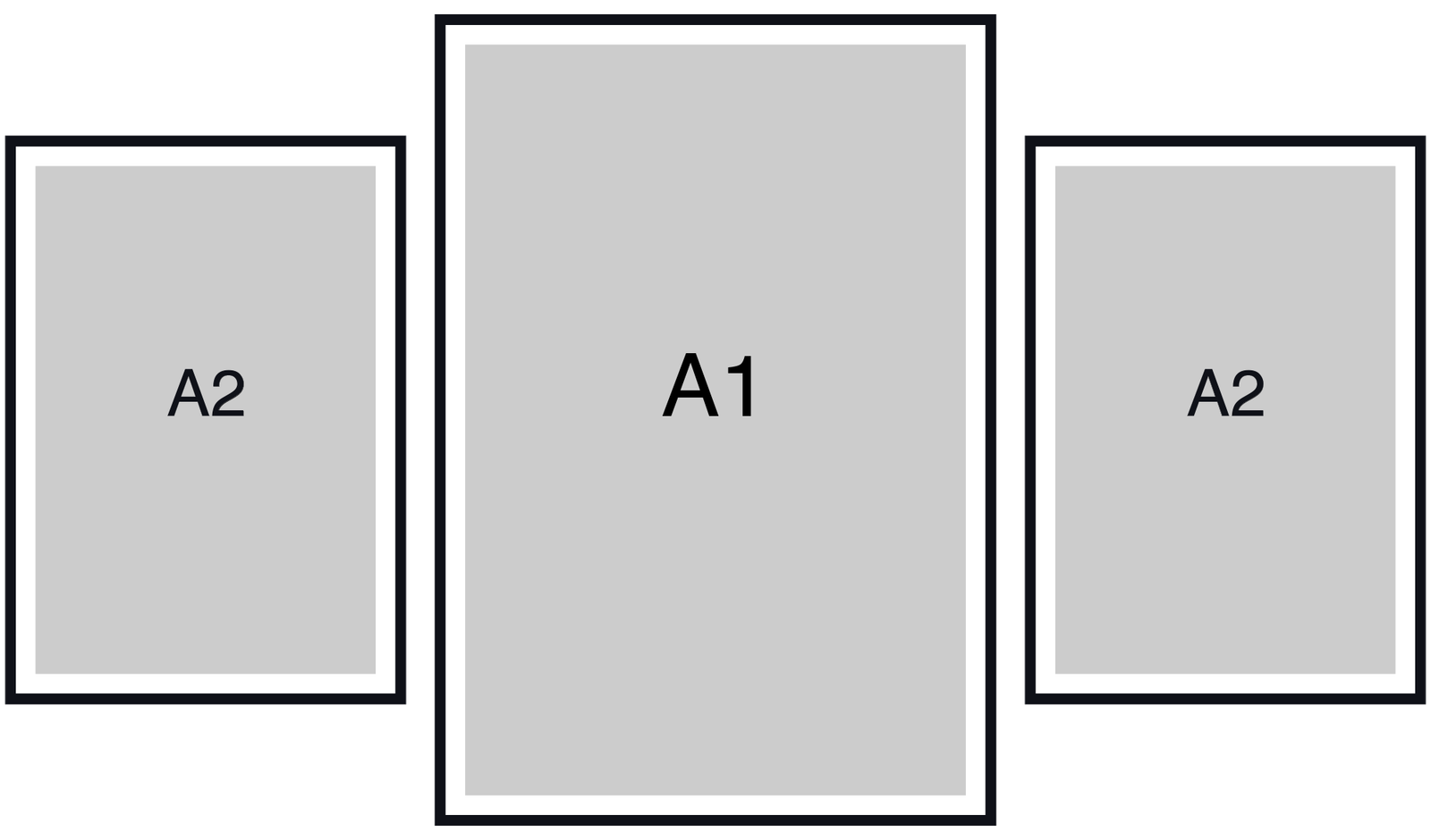 Hang the A1 first (left anchor). Set the A2 to the top-right with the same 2.75” gap, then stack the A3 below A2—keep the vertical gap identical so the right column reads clean and intentional.