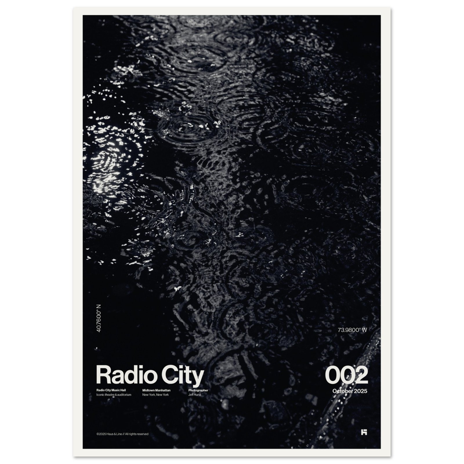 Radio City 002 turns the street into a lightbox—rain rippling across the pavement, neon breaking apart into reds and blues, and the whole night moving in slow motion. It’s bold up close, calm from a distance, and it makes a wall feel instantly “finished.”