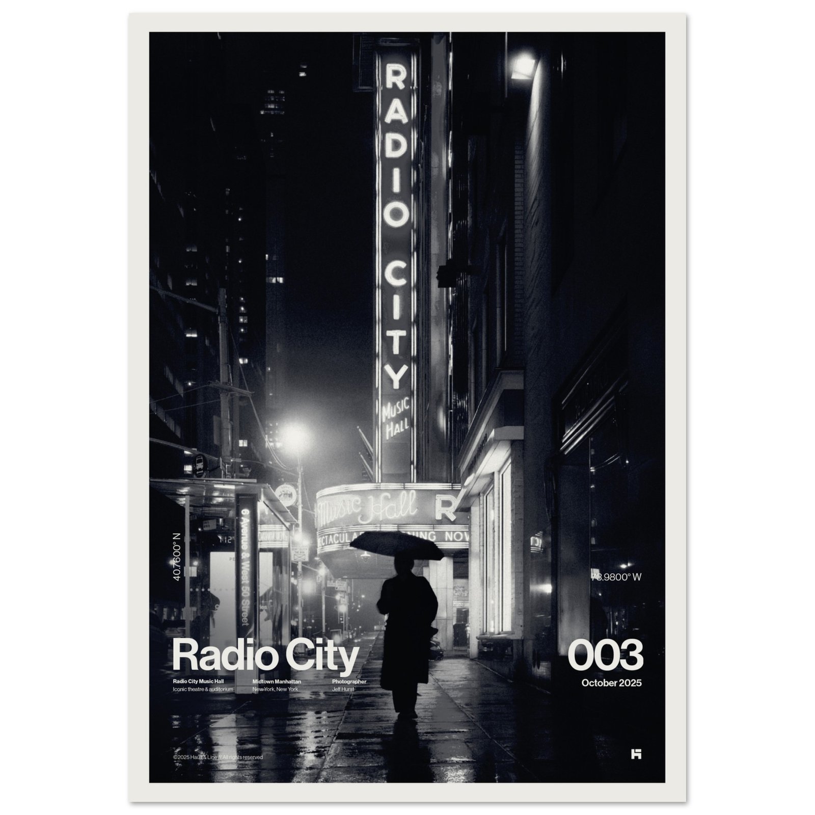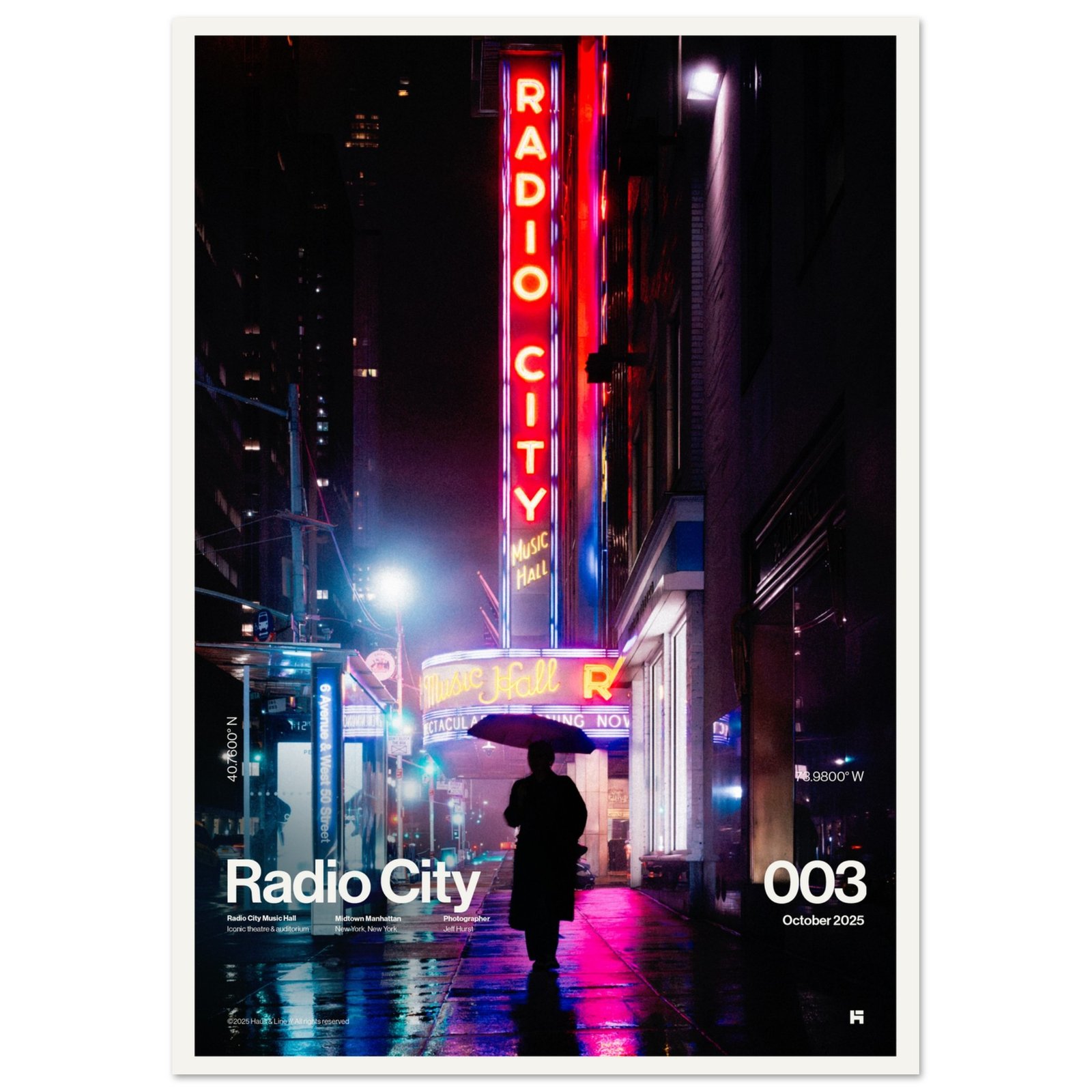 Radio City 003 is New York in the rain at its most iconic—one lone figure under an umbrella, the sidewalk shining like glass, and the Radio City sign cutting through the mist like a beacon. It’s moody, electric, and calm all at once—the kind of image that makes a room feel instantly more intentional.