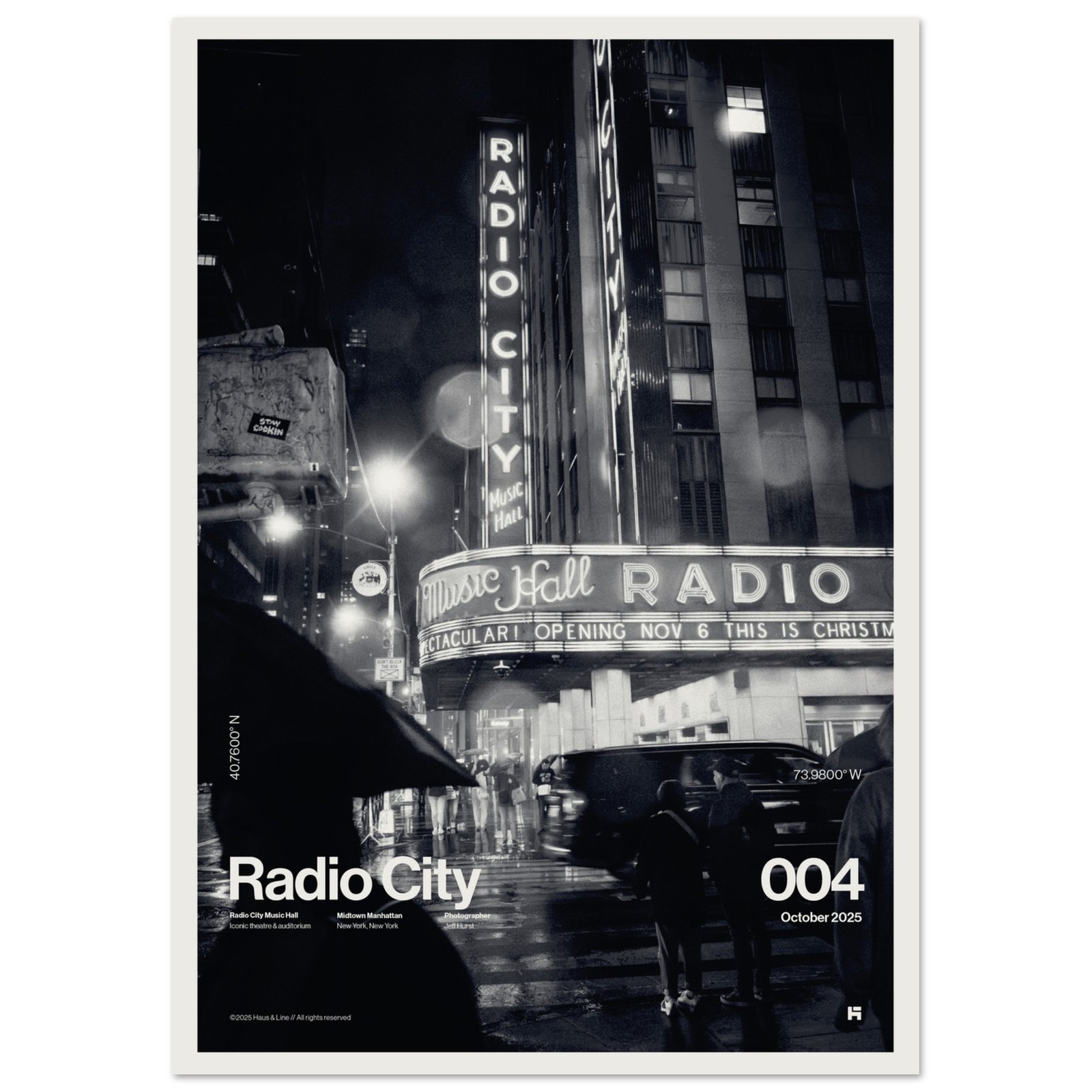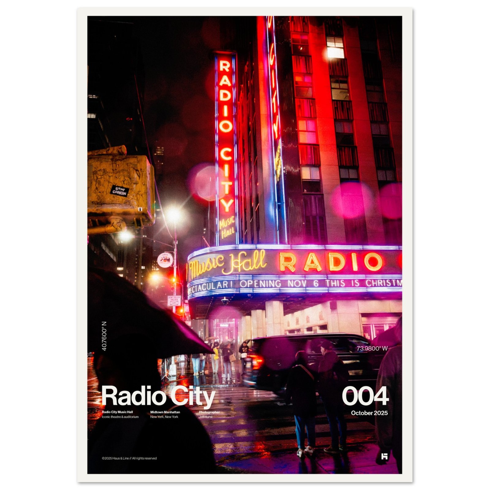 Radio City 004 feels like the city exhaling after midnight—rain still falling, neon still humming, and the whole corner lit up like a stage. The marquee wraps the street in color while silhouettes gather at the crosswalk, caught between motion and pause. It’s bold, vibrant, and unmistakably New York.